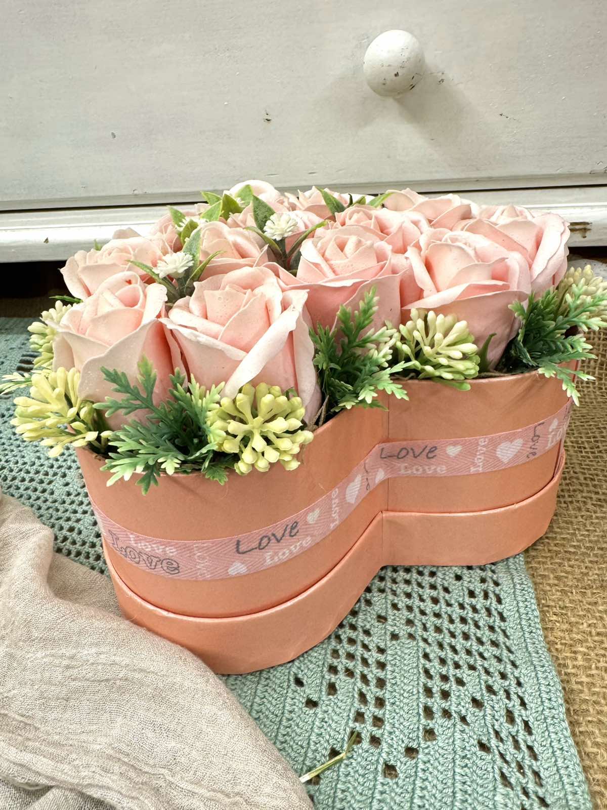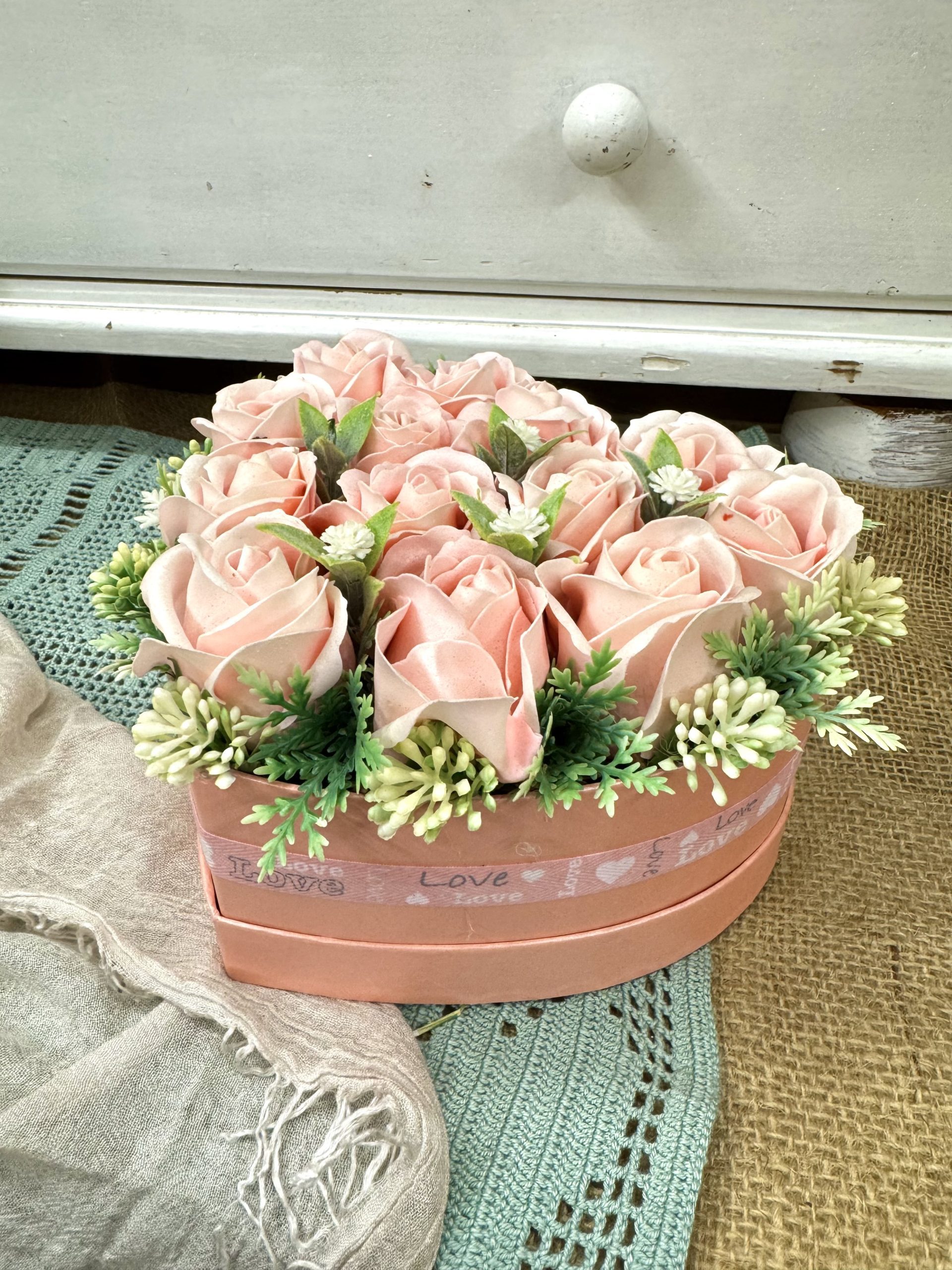 A „Szívből Jövő Szappanrózsabox” egy romantikus, szív alakú dekoráció, amely rózsaszín rózsáival és elegáns részleteivel a szeretet és a törődés tökéletes szimbóluma. Ideális ajándék különleges alkalmakra, vagy hogy otthonodba csempészd a meghittséget.